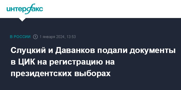 Москва. 1 января. INTERFAX.RU - Лидер ЛДПР Леонид Слуцкий и вице-спикер Госдумы, член партии "Новые люди" Владислав Даванков подали документы в Центризбирком для регистрации кандидатами в президенты России, сообщили "Интерфаксу" в ЦИК.