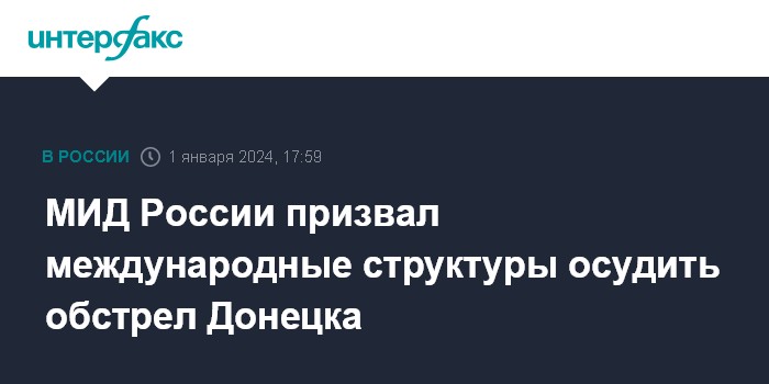 Москва. 1 января. INTERFAX.RU - Российский МИД призвал международные структуры осудить обстрел украинской армией Донецка, который привел к гибели четырех человек. Об этом говорится в заявлении на сайте ведомства.