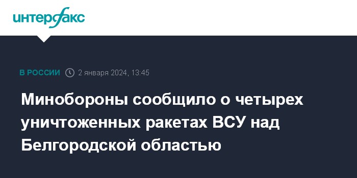 Москва. 2 января. INTERFAX.RU - Дежурными средствами противовоздушной обороны (ПВО) над Белгородской областью уничтожены четыре украинские ракеты системы "Ольха", сообщили в Минобороны РФ во вторник.