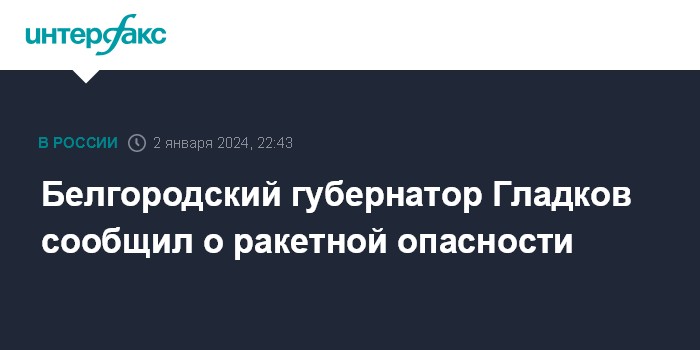 Москва. 2 января. INTERFAX.RU - Губернатор Белгородской области Вячеслав Гладков сообщил об объявленной в городе ракетной опасности.