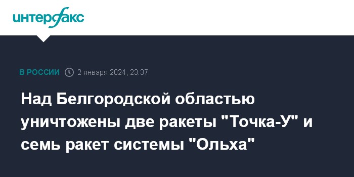 Москва. 2 января. INTERFAX.RU - Российские военные сообщили, что пресекли попытку ВСУ нанести удар по объектам на территории РФ с применением ракет реактивной системы залпового огня "Ольха" и комплекса "Точка-У".