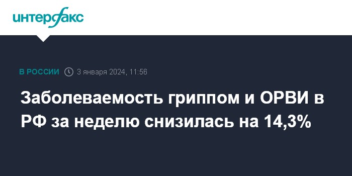 "На 52 неделе, с 25 по 31 декабря 2023 года в РФ зафиксировано снижение числа случаев заболевания гриппом и ОРВИ на 14,3% по сравнению с прошлой неделей. Превышение среднероссийских показателей заболеваемости зарегистрировано в 44 регионах", - сообщили журналистам в пресс-службе ведомства.