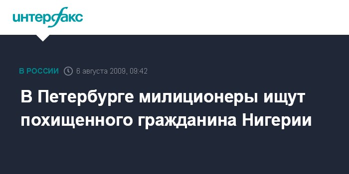 Москва. 6 августа. INTERFAX.RU - В Санкт-Петербурге в ОВД по Петроградскому району обратилась жительница города, которая сообщила о похищении неизвестными ее сожителя, гражданина Нигерии, сообщил "Интерфаксу" в четверг источник в правоохранительных органах. По его словам, в заявлении гражданка указала, что в минувший вторник нигериец позвонил ей и сообщил, что похищен неизвестными, за его возвращение необходимо заплатить выкуп в размере 8 тыс. евро. По заявлению жительницы города проводятся оперативно-розыскные мероприятия.