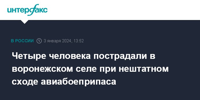 Москва. 3 января. INTERFAX.RU - Четыре человека пострадали при нештатном сходе боеприпаса с самолета ВКС над территорией села Петропавловка Острогожского района Воронежской области, который произошел накануне, сообщил губернатор региона Александр Гусев.