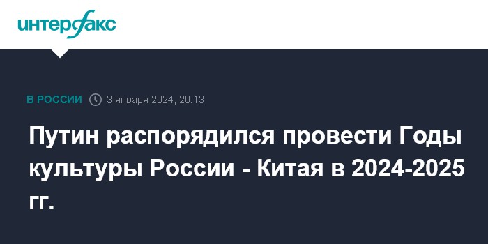 Москва. 3 января. INTERFAX.RU - Президент РФ Владимир Путин подписал распоряжение о проведении в 2024-2025гг перекрестных Годов культуры России - Китая.