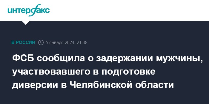 Москва. 5 января. INTERFAX.RU - ФСБ сообщила о задержании завербованного украинскими спецслужбами гражданина РФ, участвовавшего в подготовке диверсии на объекте Минобороны в Челябинской области.