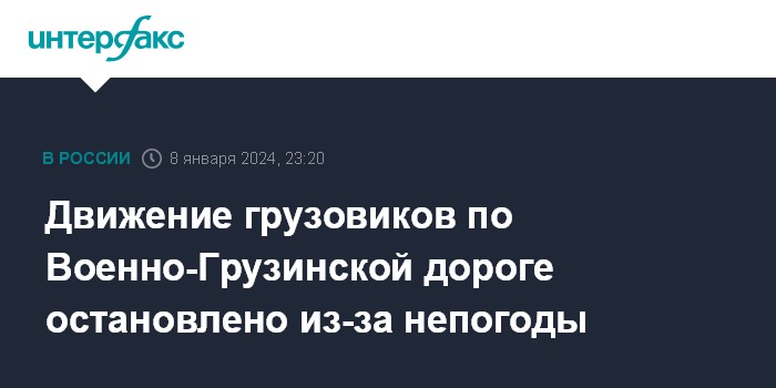 "В связи с ухудшением погодных условий на территории Грузии, и не возможностью обеспечения безопасного проезда автотранспортных средств (...) запрещено движение большегрузных автотранспортных средств на участке Владикавказ - населенный пункт Ларс в направлении на выезд из РФ с 23:00 мск 8 января", - говорится в сообщении.