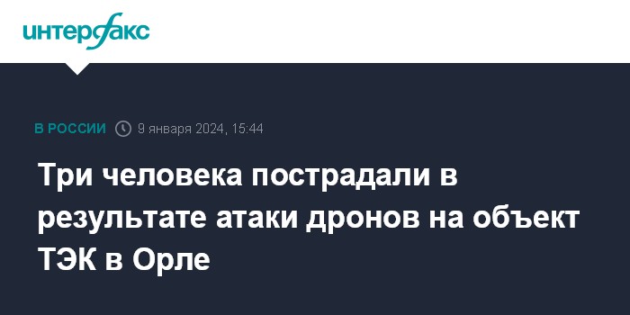 Москва. 9 января. INTERFAX.RU - Губернатор Орловской области Андрей Клычков сообщил о трех пострадавших в результате падения двух беспилотных летательных аппаратов на объект топливно-энергетического комплекса в областном центре.