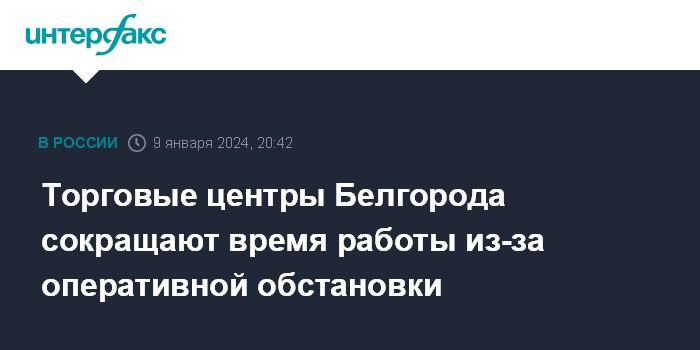 Москва. 9 января. INTERFAX.RU - Торговые центры Белгорода сократили время работы в связи с оперативной обстановкой, сообщил губернатор региона Вячеслав Гладков.