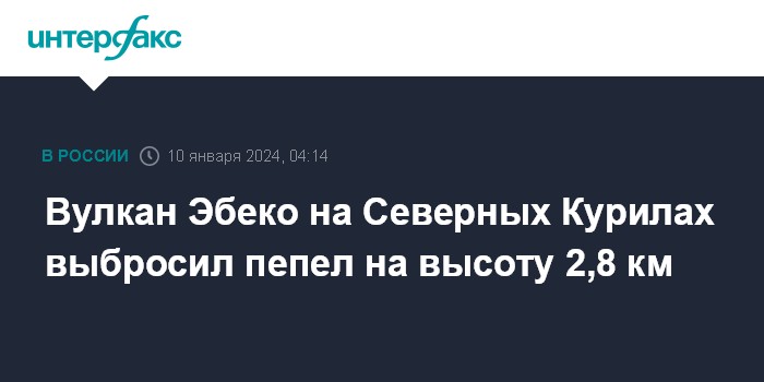Москва. 10 января. INTERFAX.RU - Вулкан Эбеко, расположенный на северокурильском острове Парамушир, утром в среду выбросил столб пепла на высоту до 2,8 км над уровнем моря, сообщает пресс-служба ГУ МЧС по Сахалинской области.