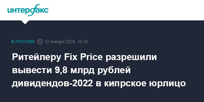 Москва. 10 января. INTERFAX.RU - Правительственная комиссия по иностранным инвестициям выдала ООО "Бэст Прайс", которое является операционной компанией Fix Price в России, разрешение на выплату дивидендов в пользу кипрской холдинговой компании в размере 9,8 млрд рублей за 2022 год.