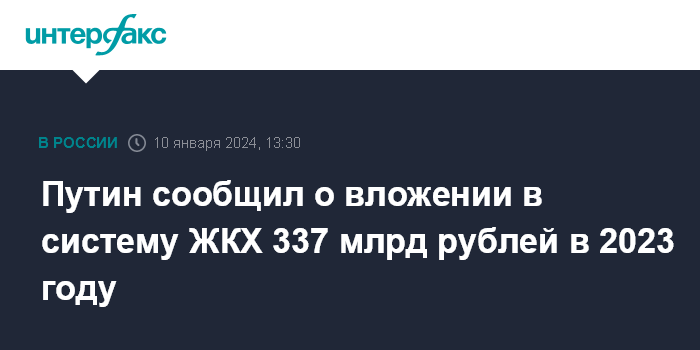Москва. 10 января. INTERFAX.RU - В 2023 году в России в систему ЖКХ направили 337 млрд рублей из разных источников, сообщил жителям Анадыря президент Владимир Путин.