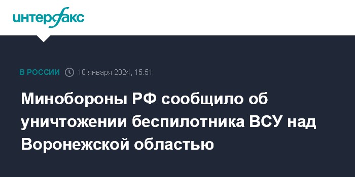 Москва. 10 января. INTERFAX.RU - Министерство обороны России заявило, что около 14:30 по московскому времени дежурными средствами противовоздушной обороны (ПВО) уничтожен украинский беспилотник самолетного типа над Воронежской областью.