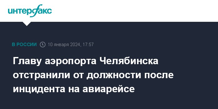 "Инцидент, произошедший 6 января на рейсе авиакомпании "Россия", свидетельствует о недобросовестном отношении к своим обязанностям одного из руководителей крупного авиапредприятия. За недопустимое поведение и несоответствие стандартам и ценностям ООО "Новапорт Холдинг" генеральный директор аэропорта Челябинск отстранен от занимаемой должности", - отметили в "Новапорт Холдинг".