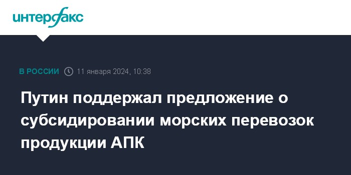 Москва. 11 января. INTERFAX.RU - Президент РФ Владимир Путин поддержал предложение о субсидировании перевозок продукции АПК морским транспортом и пообещал его "обязательно проработать".