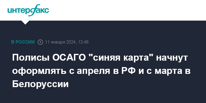 Москва. 11 января. INTERFAX.RU - Полисы международного ОСАГО "синяя карта" начнут оформляться российскими автовладельцами для поездок в Белоруссию с 1 апреля 2024 года. Об этом сообщил исполнительный директор бюро "Зеленая карта" Российского союза автостраховщиков (РСА) Сергей Разуван на пресс-конференции в четверг.