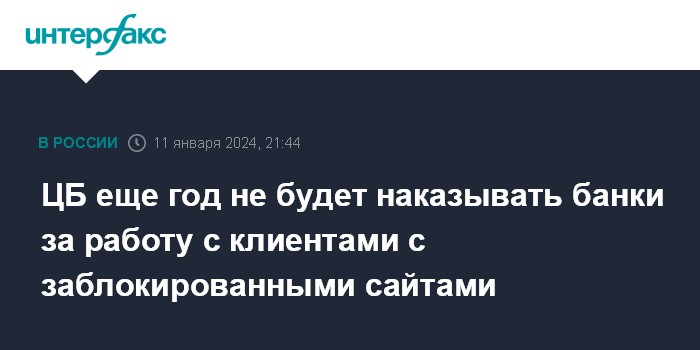 Москва. 11 января. INTERFAX.RU - Банк России продлил до конца 2024 года период, в течение которого к кредитным организациям не будут применяться меры за нарушение запрета на банковское обслуживание организаций, чьи сайты включены в единый реестр запрещенных в России интернет-ресурсов.