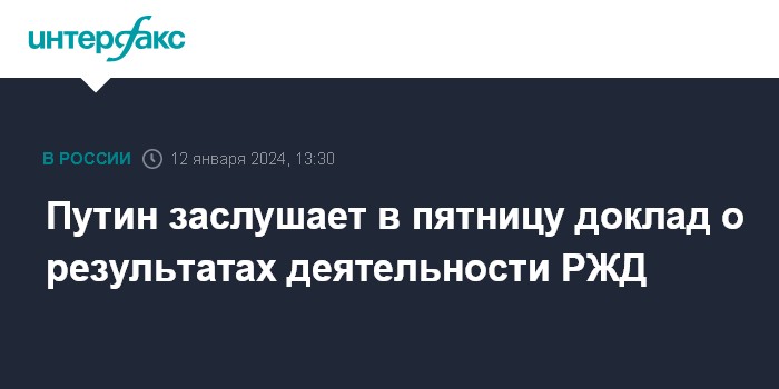 Москва. 12 января. INTERFAX.RU - Президент РФ Владимир Путин заслушает в пятницу доклад главы РЖД Олега Белозерова о результатах деятельности компании, сообщил пресс-секретарь главы государства Дмитрий Песков.
