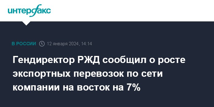 Москва. 12 января. INTERFAX.RU - Экспортные перевозки по сети ОАО "Российские железные дороги" в восточном направлении выросли в 2023 году на 7% к 2022 году, сообщил президенту Владимиру Путину генеральный директор компании Олег Белозеров.