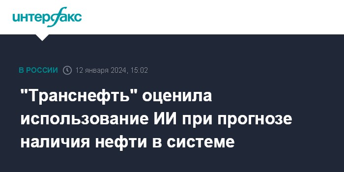 Москва. 12 января. INTERFAX.RU - "Транснефть" изучает возможность использования инновационных методов искусственного интеллекта и машинного обучения для проведения анализа данных. Компания уже опробовала применения ИИ в прогнозах о наличии нефти в системе.