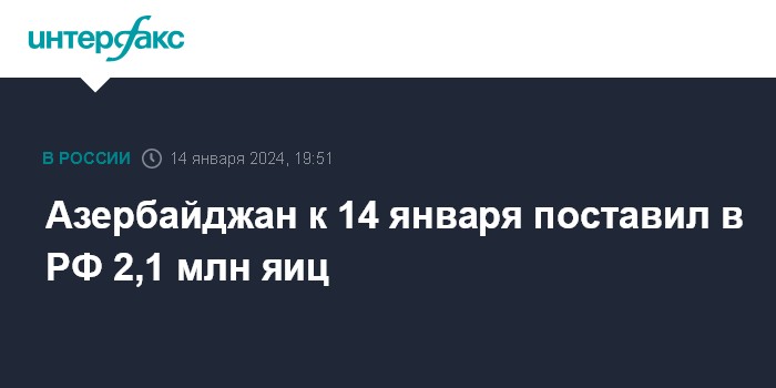 Москва. 14 января. INTERFAX.RU - Азербайджан, по данным на 14 января, поставил в РФ 2,1 млн яиц, сообщает Россельхознадзор в своем телеграм-канале.