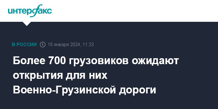 Москва. 15 января. INTERFAX.RU - Несколько сотен грузовиков ждут проезда по Военно-Грузинской дороге, которую закрыли для проезда большегрузного транспорта вечером 12 января, сообщается на сайте центра организации дорожного движения в Северной Осетии.