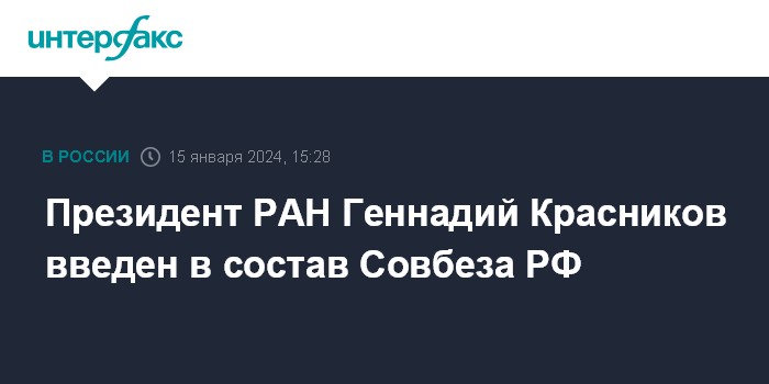 Москва. 15 января. INTERFAX.RU - Президент РФ Владимир Путин включил в состав Совета безопасности РФ президента Российской академии наук Геннадия Красникова.