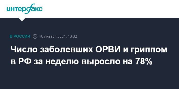 Москва. 16 января. INTERFAX.RU - В России отмечается прогнозируемый рост заболеваемости ОРВИ и гриппом, число заболевших по сравнению с прошлой неделей выросло на 78%, сообщили в Роспотребнадзоре.