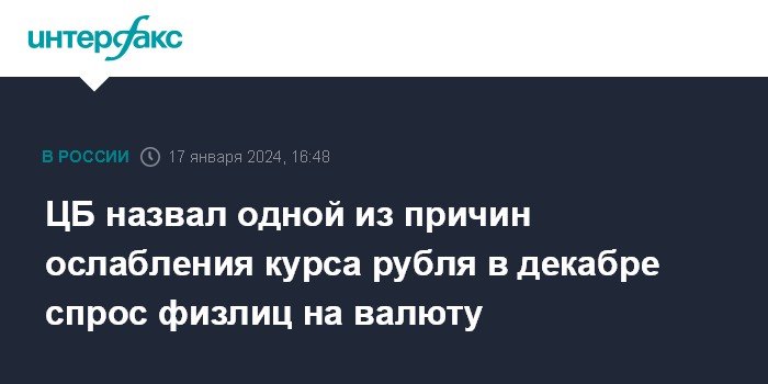 ЦБ назвал одной из причин ослабления курса рубля в декабре спрос физлиц на валюту