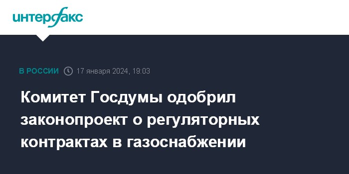 Москва. 17 января. INTERFAX.RU - Комитет Госдумы по энергетике одобрил к принятию в первом чтении законопроект, который закрепляет в законе "О газоснабжении в России" практику заключения регуляторных контрактов между органами власти и газораспределительными организациями.