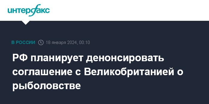 Москва. 18 января. INTERFAX.RU - Россия планирует денонсировать соглашение с Великобританией о рыболовстве, подписанное еще в советское время.