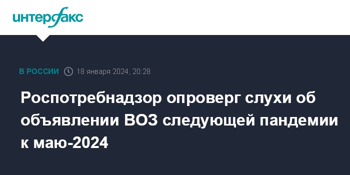 "Роспотребнадзор в связи с распространением в некоторых телеграм-каналах информации о заявлении Гендиректора ВОЗ про якобы "грядущую в мае 2024 года новую пандемию", сообщает: внимательное изучение высказываний, на которые ссылаются телеграмм-каналы, показывает, что они интерпретированы некорректно", - сообщили журналистам в пресс-службе ведомства.