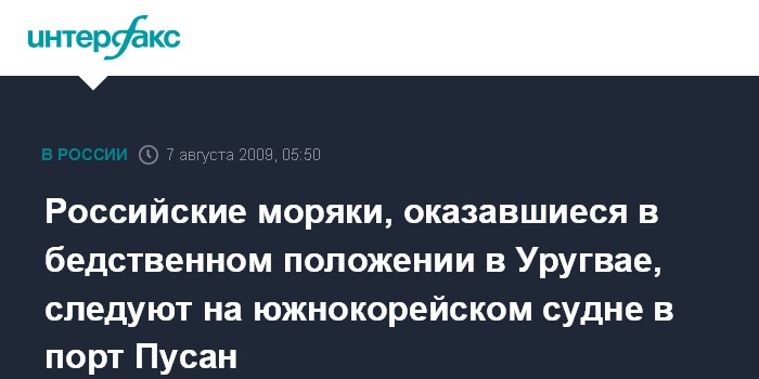 Южно-Сахалинск. 7 августа. ИНТЕРФАКС - ДАЛЬНИЙ ВОСТОК - Российские моряки, которые находились в Уругвае, в настоящее время следуют на южнокорейском рыболовном судне "Таснуй" в порт Пусан (Республика Корея), сообщили агентству "Интерфакс - Дальний Восток" в представительстве МИД РФ в Южно-Сахалинске.
