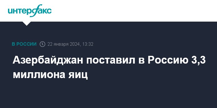 Москва. 22 января. INTERFAX.RU - По состоянию на 22 января в Россию из Азербайджана было ввезено 3,3 млн штук пищевых яиц, сообщили "Интерфаксу" в Россельхознадзоре.