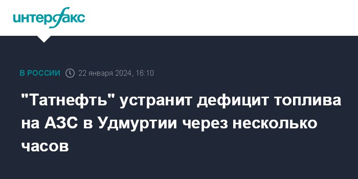 Москва. 22 января. INTERFAX.RU - "Татнефть" планирует в понедельник к вечеру устранить дефицит топлива на своих АЗС в Удмуртии, возникший в результате закрытия автодорог из-за аномального снегопада.
