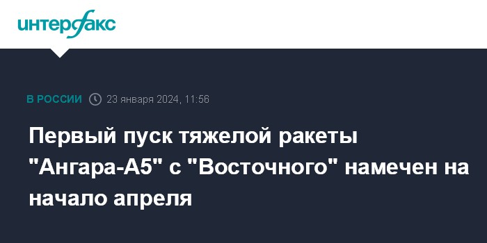 Москва. 23 января. INTERFAX.RU - Глава "Роскосмоса" Юрий Борисов сообщил, что первый пуск тяжелой ракеты-носителя "Ангара-А5" с космодрома Восточный состоится в первой декаде апреля.