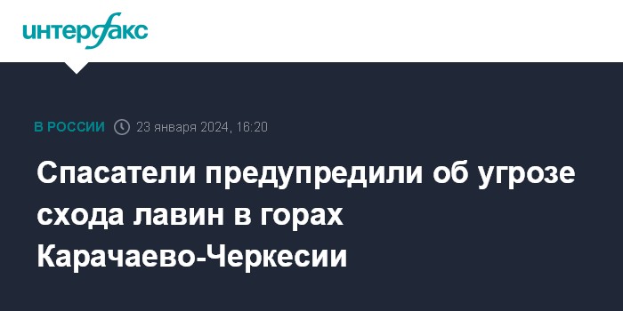 Москва. 23 января. INTERFAX.RU - Сход снежных лавин возможен в горах Карачаево-Черкесии, в республике объявлено экстренное предупреждение, сообщает ГУ МЧС России по КЧР во вторник.