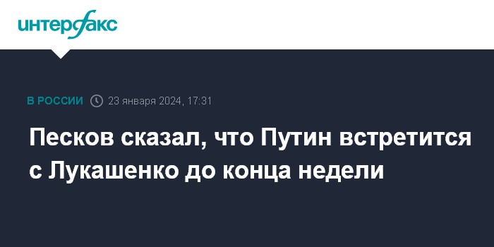Москва. 23 января. INTERFAX.RU - Президенты России и Белоруссии Владимир Путин и Александр Лукашенко встретятся до конца этой недели, заявил пресс-секретарь главы российского государства Дмитрий Песков.