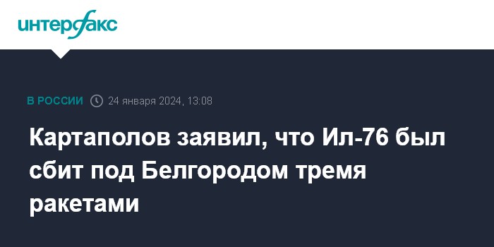 Москва. 24 января. INTERFAX.RU - Самолет Ил-76 с военнопленными ВСУ был сбит в Белгородской области тремя ракетами, заявил председатель комитета Госдумы по обороне Андрей Картаполов.