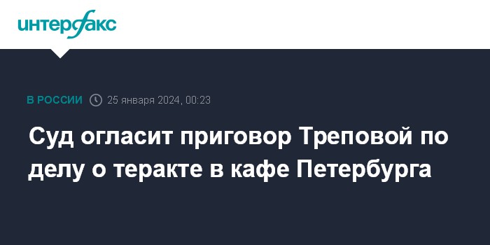 Москва. 25 января. INTERFAX.RU - Второй Западный окружной военный суд в четверг огласит приговор Дарье Треповой (внесена в список террористов и экстремистов Росфинмониторинга - ИФ), обвиняемой во взрыве в петербургском кафе, в результате которого погиб военный журналист Максим Фомин (Владлен Татарский).