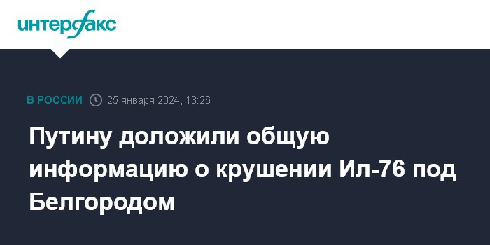 Москва. 25 января. INTERFAX.RU - Военные предоставили президенту Владимиру Путину общую информацию в связи с крушением военно-транспортного Ил-76 под Белгородом, в Кремле ждут результатов расследования.