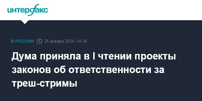 Москва. 25 января. INTERFAX.RU - Госдума в четверг приняла в первом чтении проекты законов, направленные на противодействие распространению в информационном пространстве деструктивного контента в виде треш-стримов.