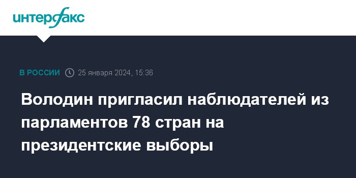 Москва. 25 января. INTERFAX.RU - Спикер Госдумы Вячеслав Володин пригласил на президентские выборы в марте наблюдателей из парламентов 78 стран, сообщила пресс-служба палаты.