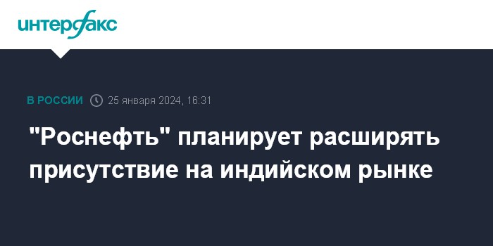 Москва. 25 января. INTERFAX.RU - "Роснефть" планирует расширять свое присутствие на индийском рынке, сказал президент РФ Владимир Путин в ходе встречи со студентами Калининградской области, отвечая на вопрос учащегося из Индии.