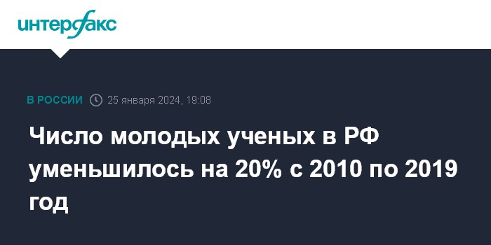 Москва. 25 января. INTERFAX.RU - Количество молодых ученых в России в возрасте до 29 лет с 2010 по 2019 год уменьшилось почти на 20%, что является предпосылкой для сокращения научного потенциала страны и может вести к отставанию в высокотехнологичных отраслях экономики. Это отмечается в Стратегии молодежной политики в РФ на период до 2030 года.