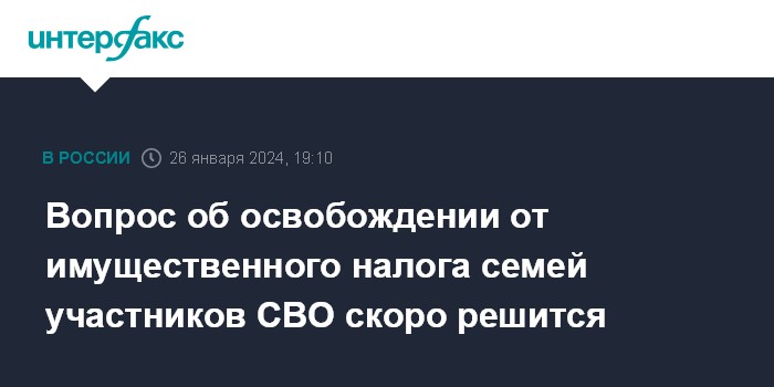 Москва. 26 января. INTERFAX.RU - Вопрос об освобождении от имущественного налога членов семей участников военной спецоперации будет решен в ближайшее время, пообещал студентам-участникам СВО президент Владимир Путин