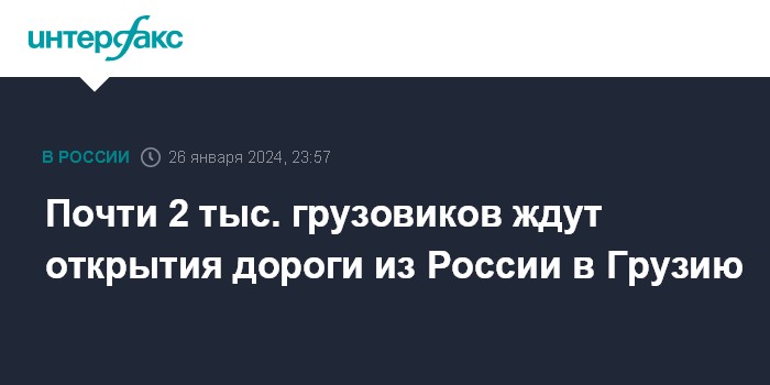 Москва. 26 января. INTERFAX.RU - Количество грузовых автомобилей, ожидающих открытия проезда из РФ в Грузию через пункт пропуска "Верхний Ларс", достигло почти 2 тыс. машин, сообщается на сайте центра организации дорожного движения Северной Осетии.
