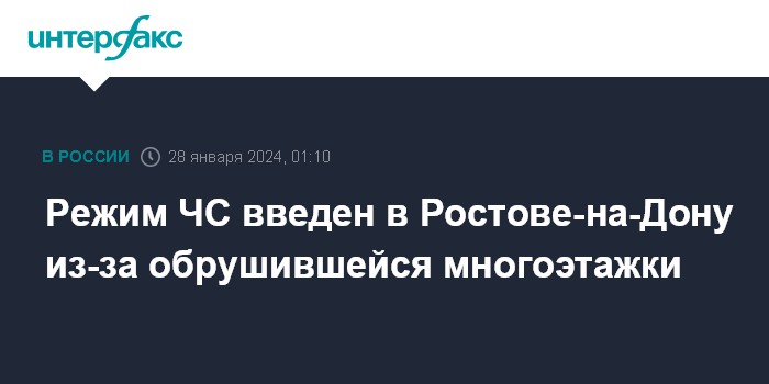 Москва. 28 января. INTERFAX.RU - Власти Ростова-на-Дону ввели режим ЧС для ликвидации последствий на месте частично обрушившегося многоквартирного дома.