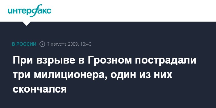 Москва. 7 августа. INTERFAX.RU - Один из трех пострадавших от взрыва в центре чеченской столицы сотрудников правоохранительных органов скончался, заявляют в СКП. Как сообщил "Интерфаксу" в пятницу официальный представитель Следственного управления СКП РФ по Чеченской республике, в Грозном скончался представитель правоохранительных органов, получивший ранение в результате осуществленного около 16 часов подрыва неустановленного взрывного устройства.