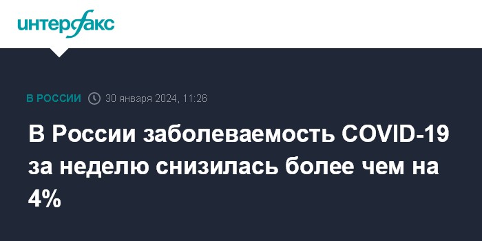 Москва. 30 января. INTERFAX.RU - В России за неделю с 22 по 28 января заболеваемость COVID-19 уменьшилась к предыдущей неделе на 4,1%, сообщил федеральный оперштаб по борьбе с коронавирусом. За неделю умерли 111 заразившихся.